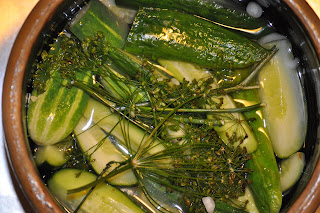 - Place dill and onion on the bottom of your crock, add the cukes and another stem of dill on top. Pour liquid over the top.