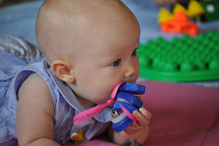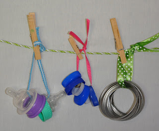 Lydia loves to chew on ribbon and random things from the kitchen drawers, so I thought I’d encourage her love of the kitchen and recycle my old stuff by making these fun gadgets.