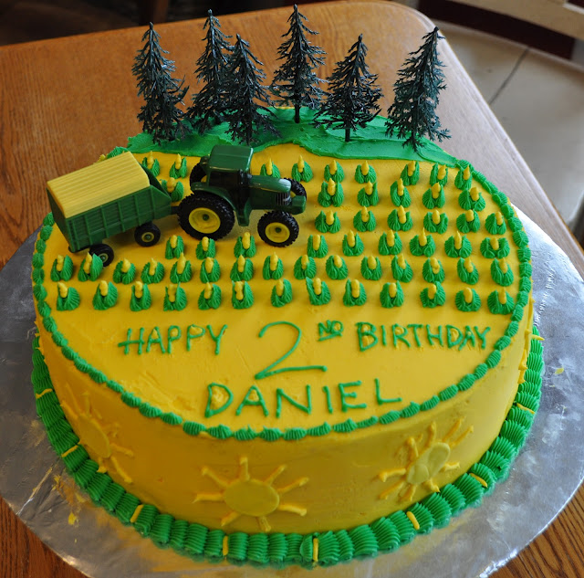 A simple 2 layer chocolate cake decorated to resemble corn rows and harvest time.
